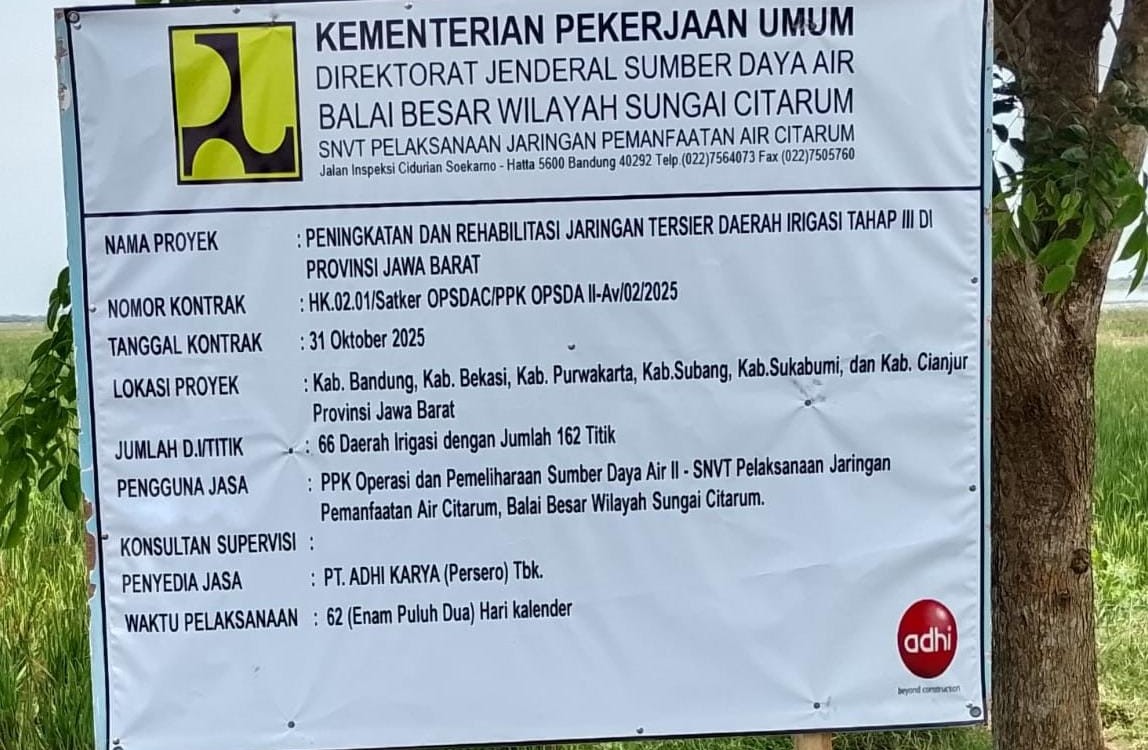 Subang | mediaantikorupsi.com – Paket Proyek Milik BBWS ( Balai Besar Wilayah Sungai ) Citarum Tahun Anggaran 2025 dengan judul peningkatan dan rehabilitasi jaringan tersier daerah irigasi tahap III di Provinsi Jawa Barat yang rikerjakan oleh PT. Adhi Karya ( Persero ) Tbk. salah satunya yang ada di Kabupaten Subang, sebagaimana tercantum dalam papan informasi proyek.