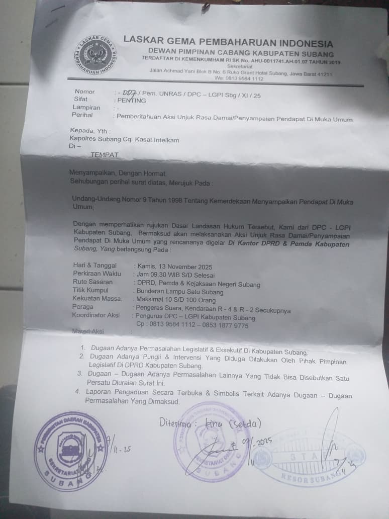 Maka untuk itu LSM LGPI dalam waktu dekat akan menggelar aksi unjuk rasa damai ke gedung DPRD dan Pemda Subang serta mendesak aparat penegak hukum segera bertindak untuk pemangilan kepada pihak – pihak yang diduga melakukan perbuatan tindak pidana korupsi gaya baru, dan LSM LGPI akan mengundang fakar hukum, hasil kajian nanti akan kita serahkan ke KPK,” tegas Ginting.