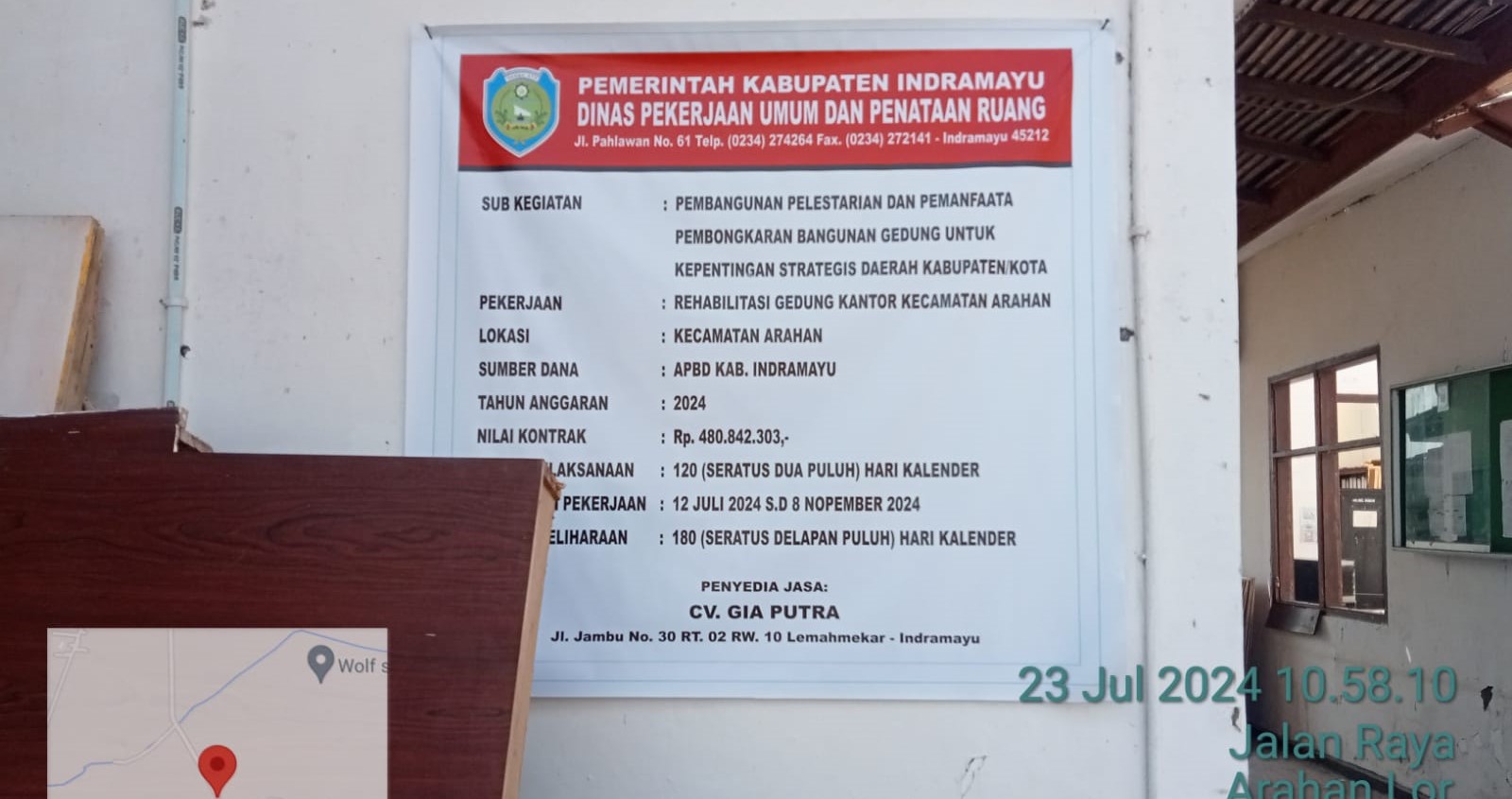 Diketahui, proyek Pembongkaran/Rehabilitasi Gedung Kecamatan Arahan ini dibiayai dari APBD Kabupaten Indramayu melalui Dinas Pekerjaan Umum Dan Penataan Ruang, tahun anggaran 2024 senilai Rp.480.843.3023,00 yang dikerjakan oleh CV.GIA PUTRA dalam jangka waktu 180 hari kalender.
