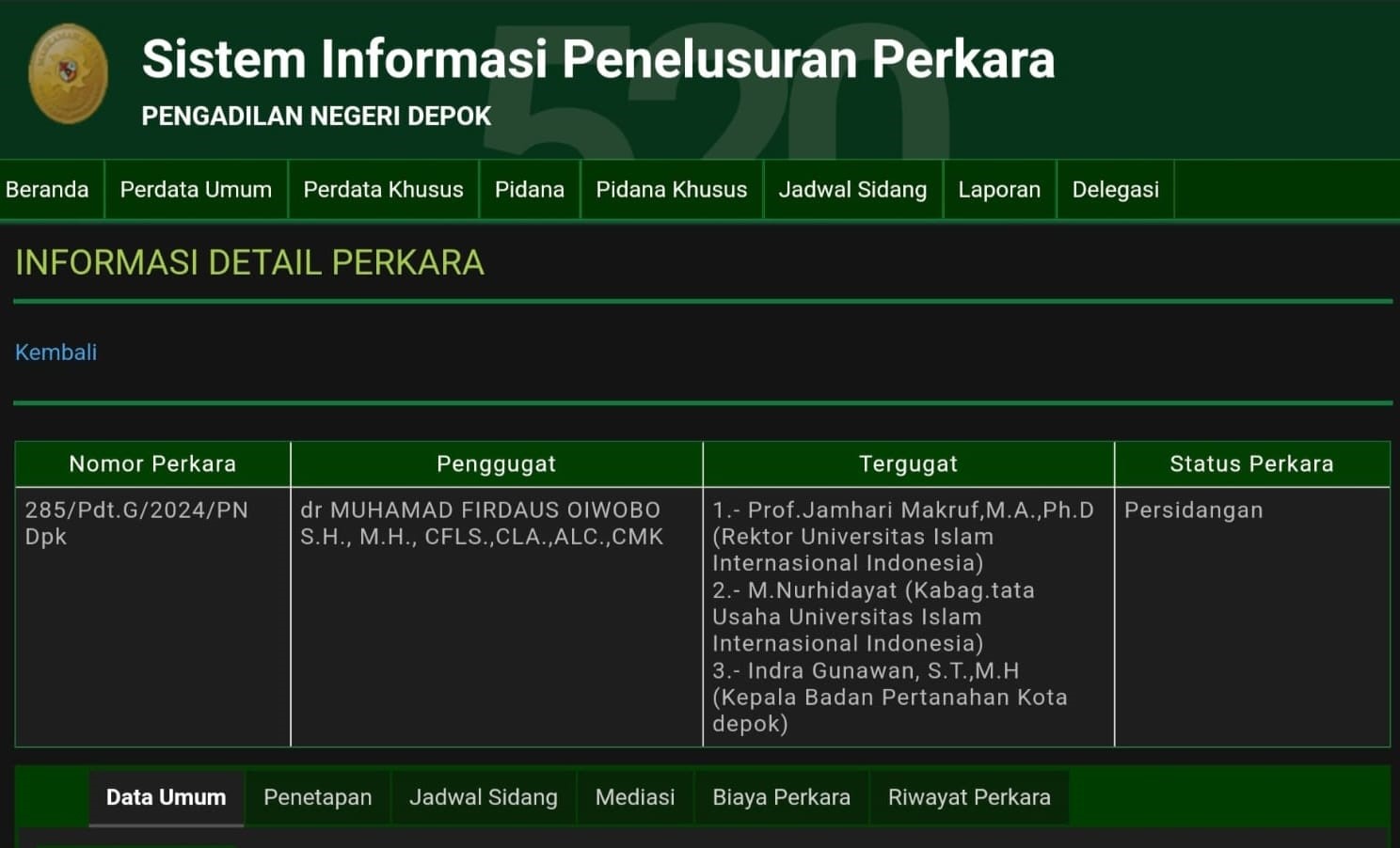 Depok mediaantikorupsi.com – Pengadilan Negeri Depok menggelar sidang dengan Penggugat dr Muhammad Firdaus Oiwobo SH, MH, dan sebagai pihak tergugat adalah Pihak dari Universitas Islama Internasional Indonesia, dan juga mantan Kepala BPN Kota Depok. Selasa 18/02/2025