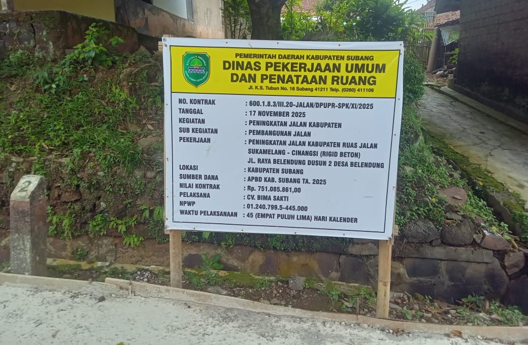 Salah satu proyek perkerjan paket yang berlokasi di RW l Desa Beledung Kecamatan Cibogo Kabupaten Subang, mangkrak sudah sampai tiga minggu belum juga dilanjutkan dengan kondisi sudah di pasang latai kerja, masih belum ada kegitan lanjutan sampai saat ini pihak CV Bima Sakti belum kunjung ada kegitan lagi dan warga menanyakan kelajutan nya .